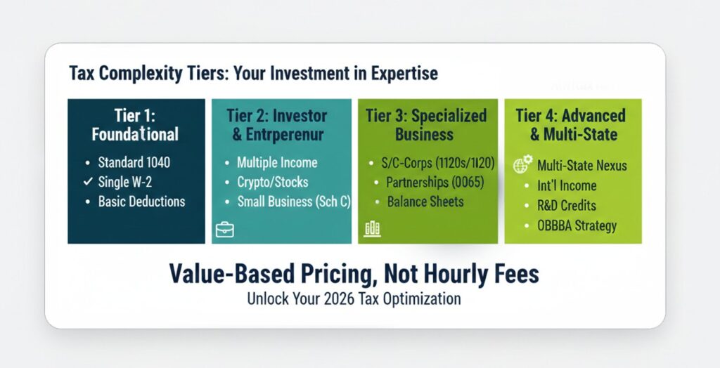 As a reliable provider, we utilize a Value-Based Pricing model. This means your fee is an investment in the accuracy and strategic depth of your return, rather than just a charge for data entry. Here is how we categorize the scope of work: